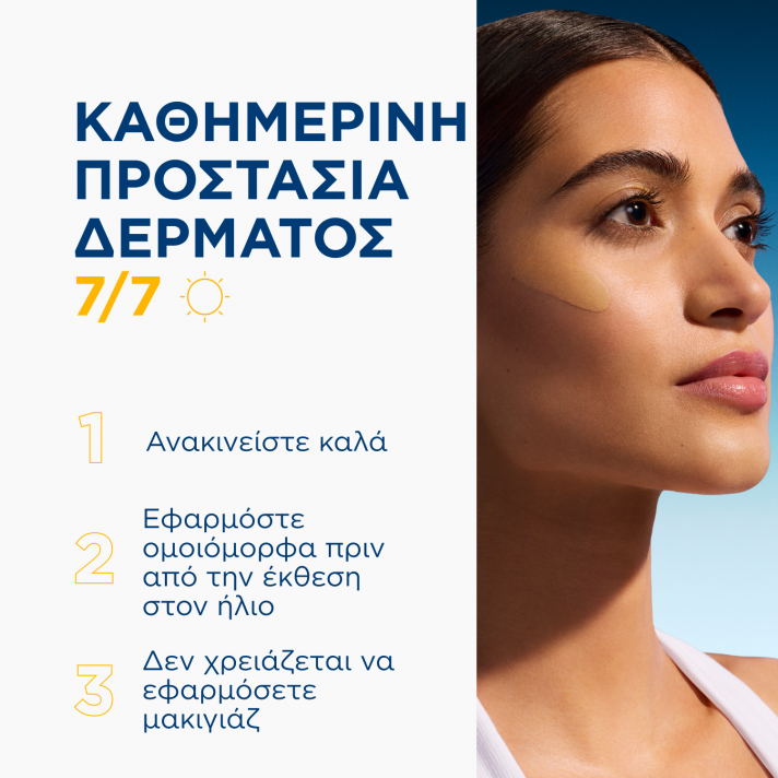 Εφαρμόστε αρκετές φορές την ημέρα όταν εκτίθεστε στον ήλιο. Μπορεί να χρησιμοποιηθεί μόνη του ή ως βάση μακιγιάζ. Διατίθεται επίσης και με χωρίς χρώμα.